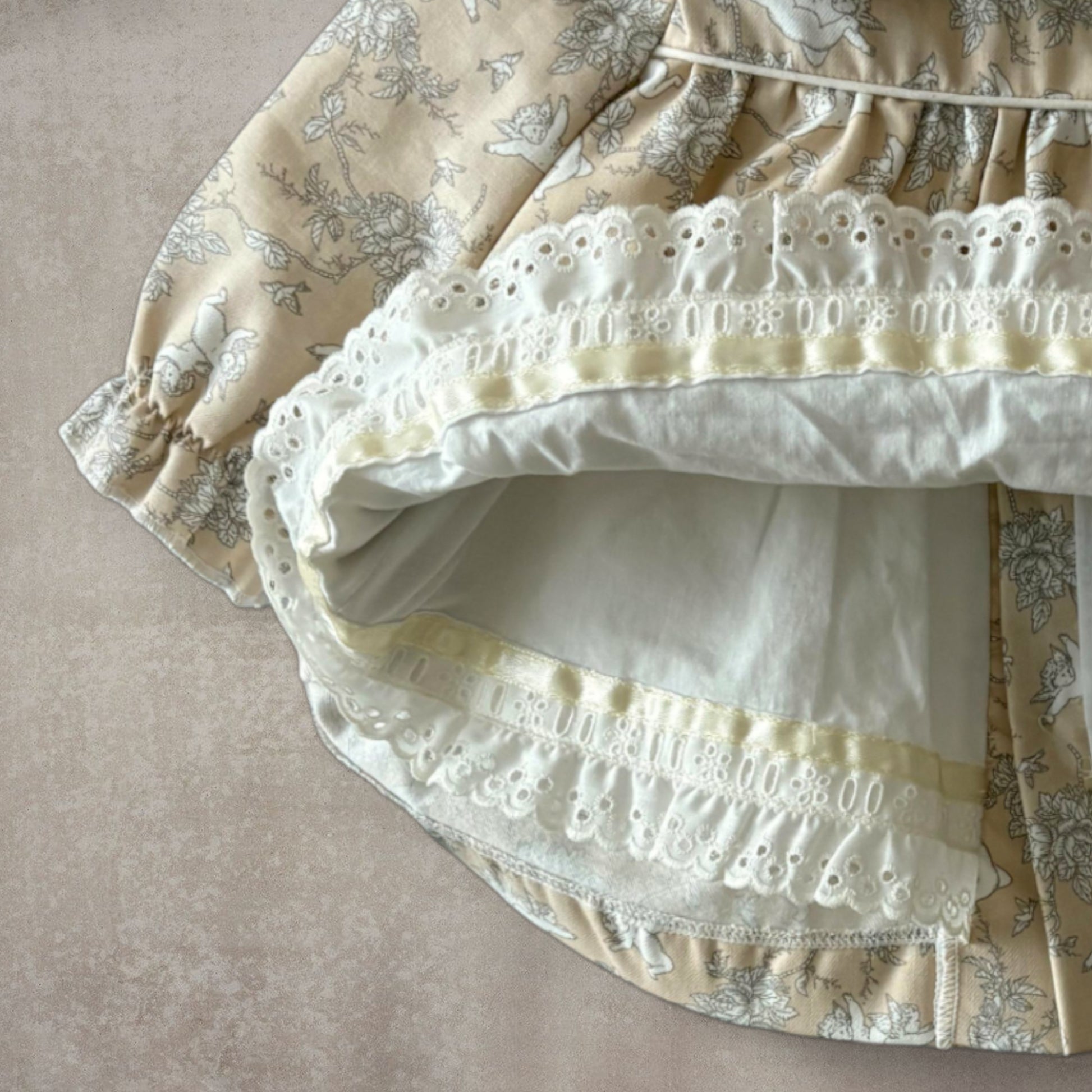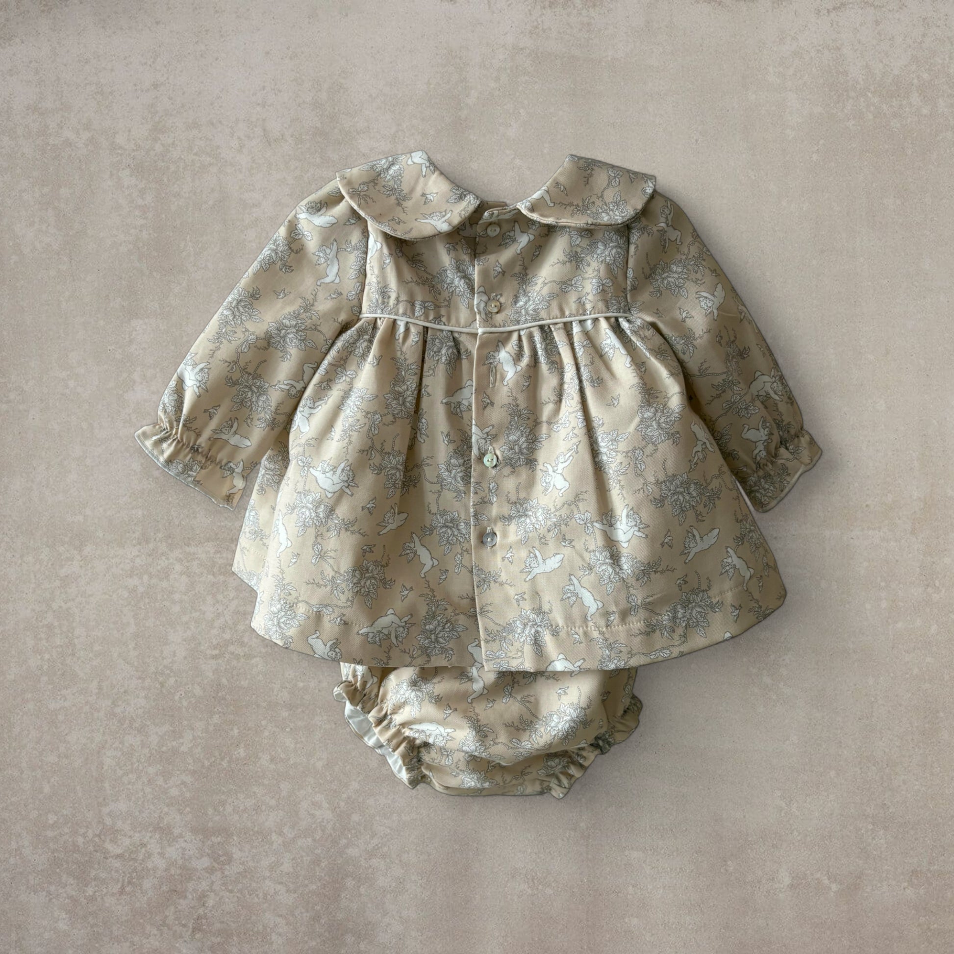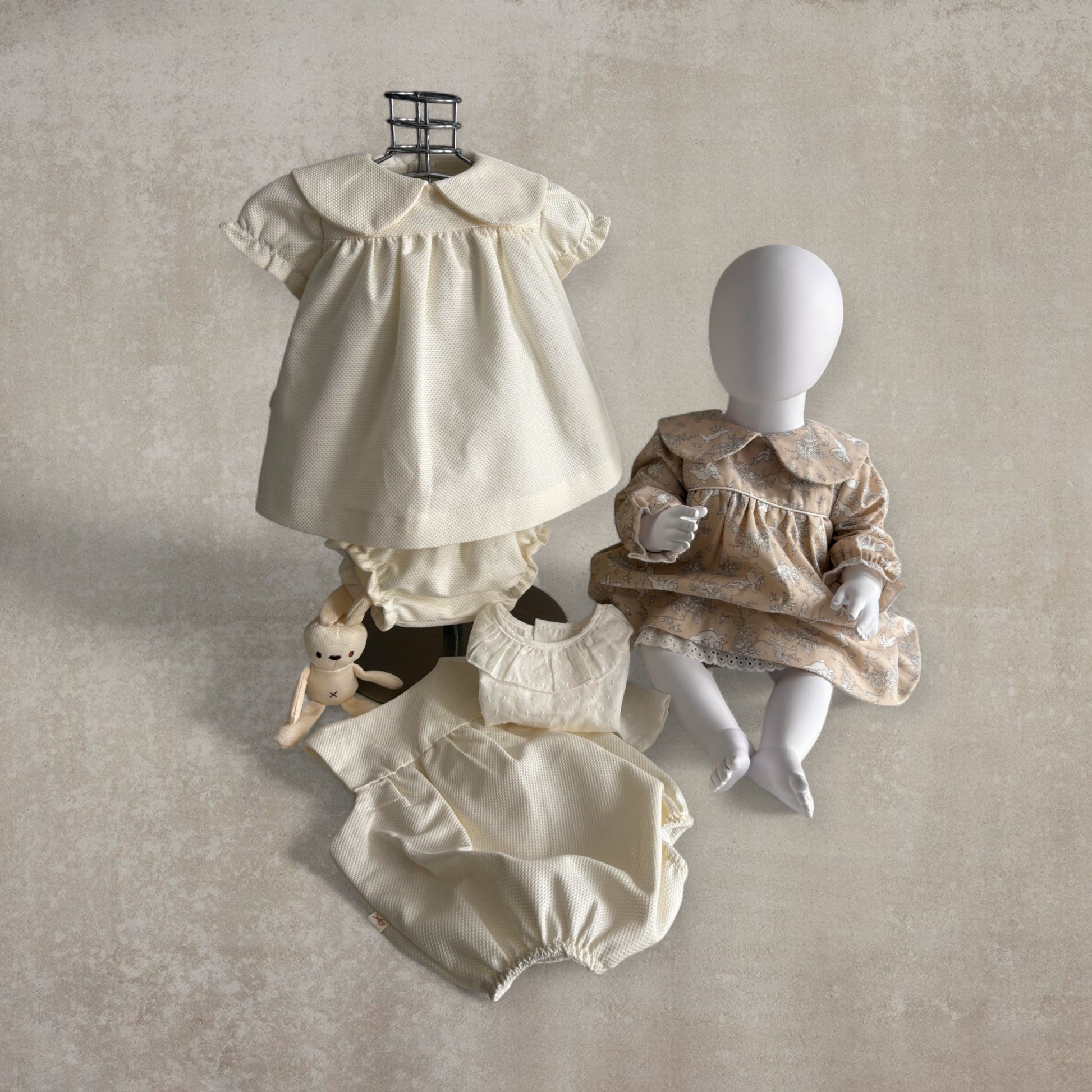 Conjunto dos piezas formado por un Vestido forrado con acabado bordado, con cuello tipo bobo y mangas largas. Braguita forrada con gomas en cintura y piernas que ofrecen un ajuste cómodo.